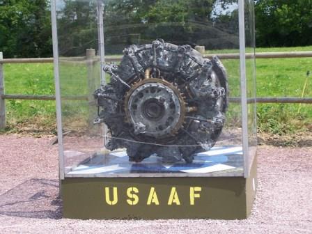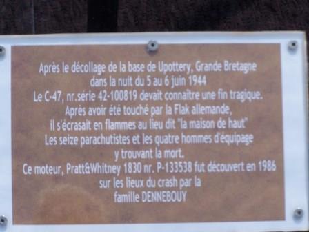 The C-47 N 42-100819 met a tragic end on the night of 5 to 6 June 1944. After its takeoff from Upottery airbase in the UK, it was hit by German AA fire and crashed in flames in "the high house" area. All sixteen paratroopers and four crewmen died in the crash. This Pratt & Whitney motor 1830 N P-133538 was discovered in 1986 at the crash site by the Dennebouy family
