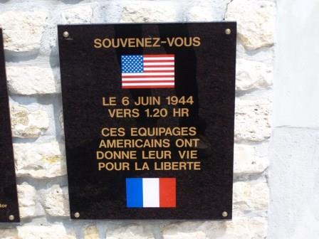 A mini-replica of a C-47 overlooks a stone wall with six black plaques with gold lettering commemorating the air crews of the C-47s that crashed in the area while dropping paratroopers on D-Day. A glassed-in container holds one of the C-47's engines.