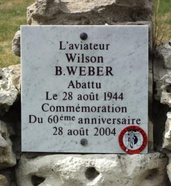 A pile of white stones supporting a vine-decorated black cross with a white plaque with black lettering commemorating the death of Lt Weber during WWII.