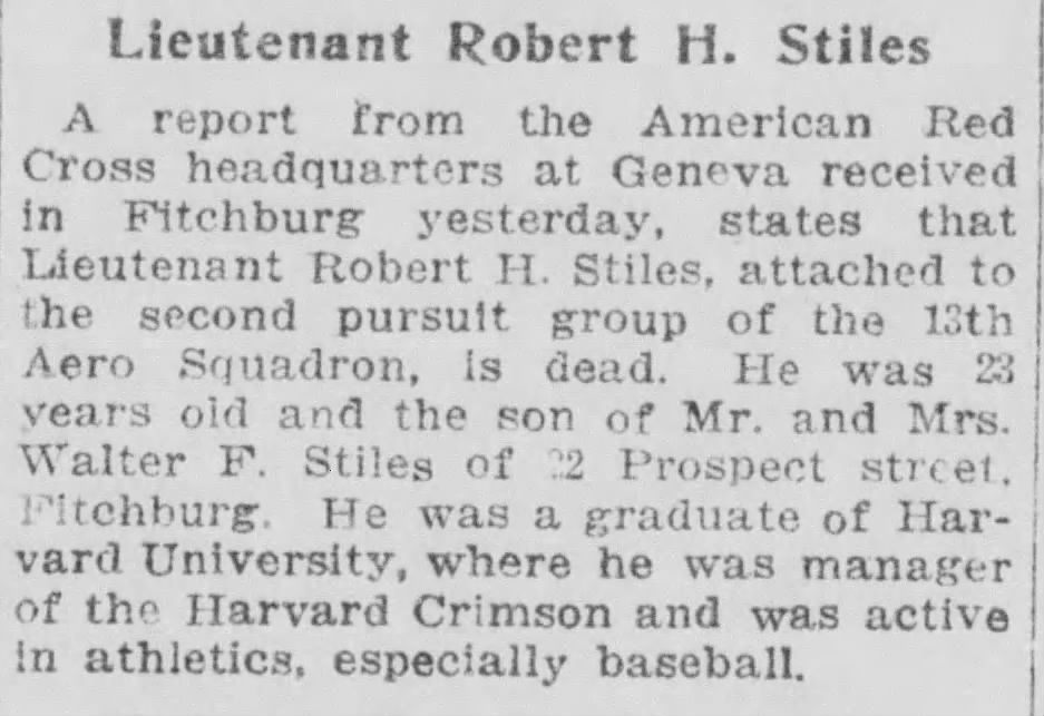 Robert Stiles, American Aviation Officer, fell and died at Pournoy, 1894-1918