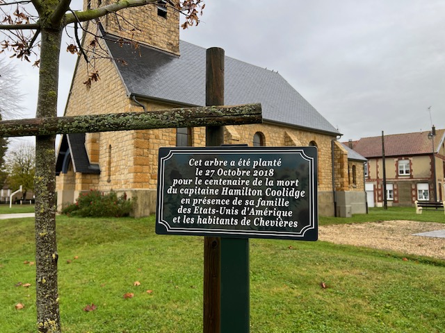 The name of Captain Hamilton 'Ham' Coolidge is inscribed on the monument aux morts. Captain Coolidge was an American Pilot and Ace in World War 1 with 9 victories. A memorial tree was also planted next to the war memorial in 2018; the 100th anniversary of Coolidge's death. Members of his family were present.