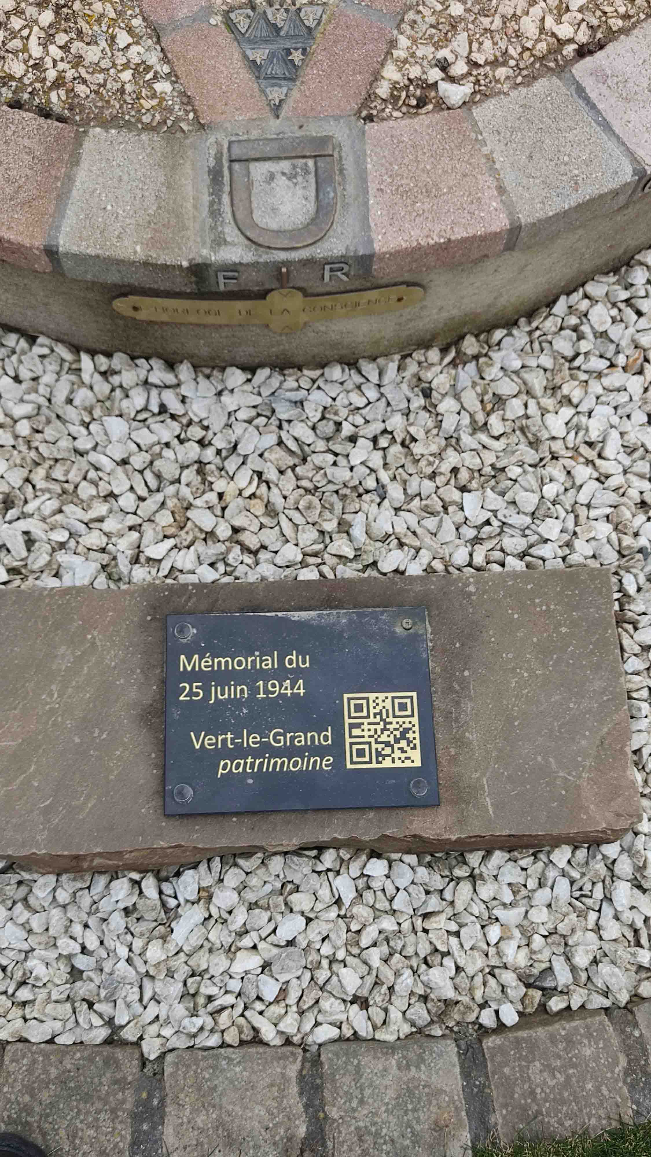 A rough fieldstone on which is mounted a dark plaque with gold lettering in French and English. The monument marks the spot where the B-24 (B-24 Liberator 41-29371 “Crippled Bitch”) went down, killing 6 members of the crew as they were bombing the nearby airfield of Brétigny-sur-Orge. The plane was part of the 786th Bomber Squadron, 466th Bomber Group flying out of Station 120 Attlebridge in Norfolk, UK.