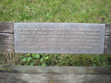 This sanctuary was established by Mr. and Mrs. Joseph Randolph Coolidge of Boston, Massachusetts, USA. It was here on teh 26th of October 1918 that their son, Hamilton Coolidge, died for liberty. The citizens of Cheivres join the Coolidge family to preserve this site and maintain for all time the spirit of liberty and friendship.