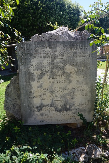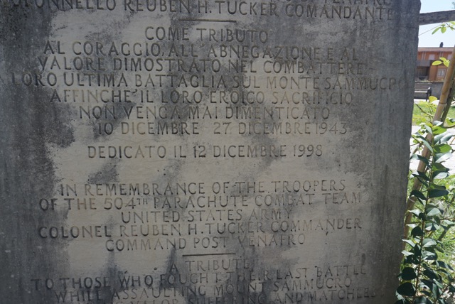 The boulder marks the location of the command post of the 504thParachute Infantry Regiment and Combat team in Venafro. The marker also commemorates the 504thinvolvement in the fighting on Mount Sammucro (also known as Monte Sambucaro- 1205 meter peak) along with the 36thInfantry Division during the assault on the Bernard Line and the Battle of San Pietro in December 1944. The peak of Mount Sammucro was key terrain, which dominated San Pietro Infine and was vital to hold in in the Fifth Army attack to move through San Pietro up to the Gustav line.