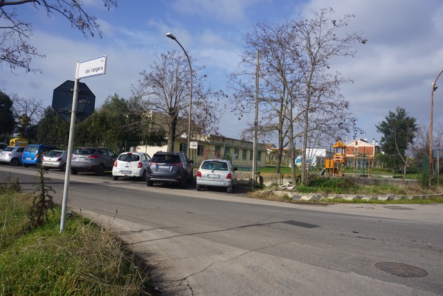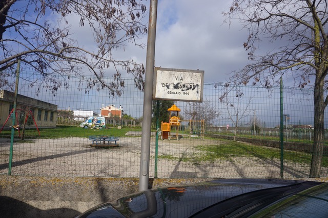The memorial road sign is located at the inspection of Via dei Rangers and Via Nettuno adjacent to a Nursery School; several road signs can be found along the 1-mile roadway.