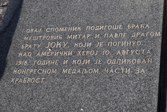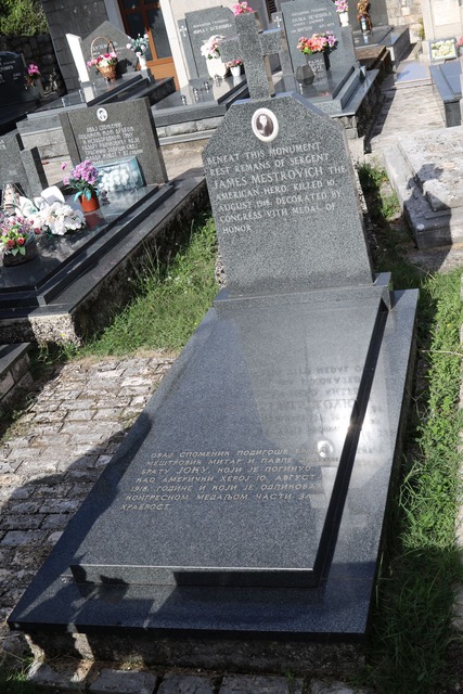 Sergeant James I. “Joko” Mestrovich (Joko Meštrović) was born on May 22, 1894 in present day Montenegro. He immigrated to the United States and served in the US Army in World War 1. He served in Company C of the 111th Infantry Regiment, 28th Infantry Division (Pennsylvania National Guard).He was awarded the Medal of Honor for his actions during fighting at Fismette, France on August 10, 1918.