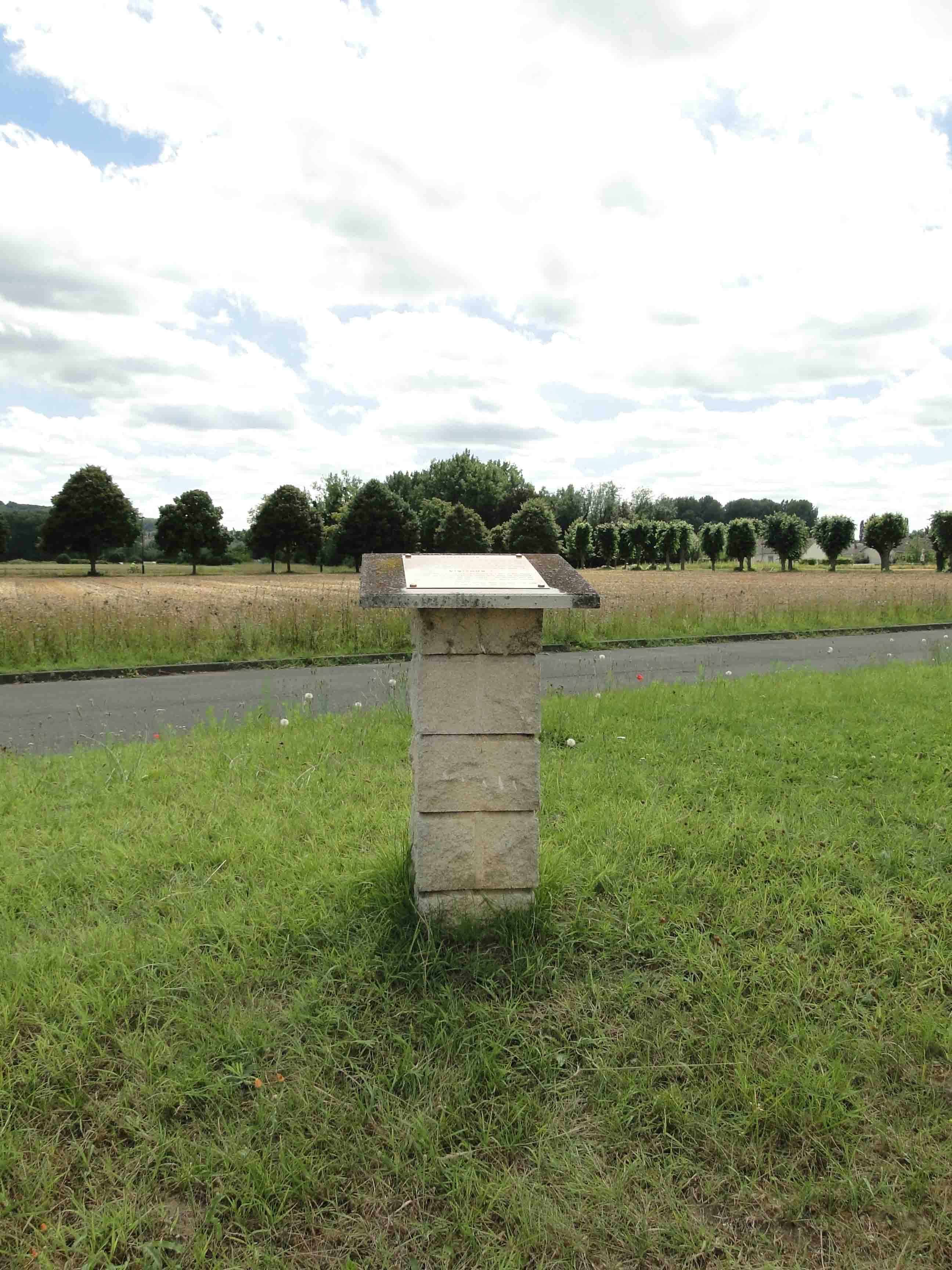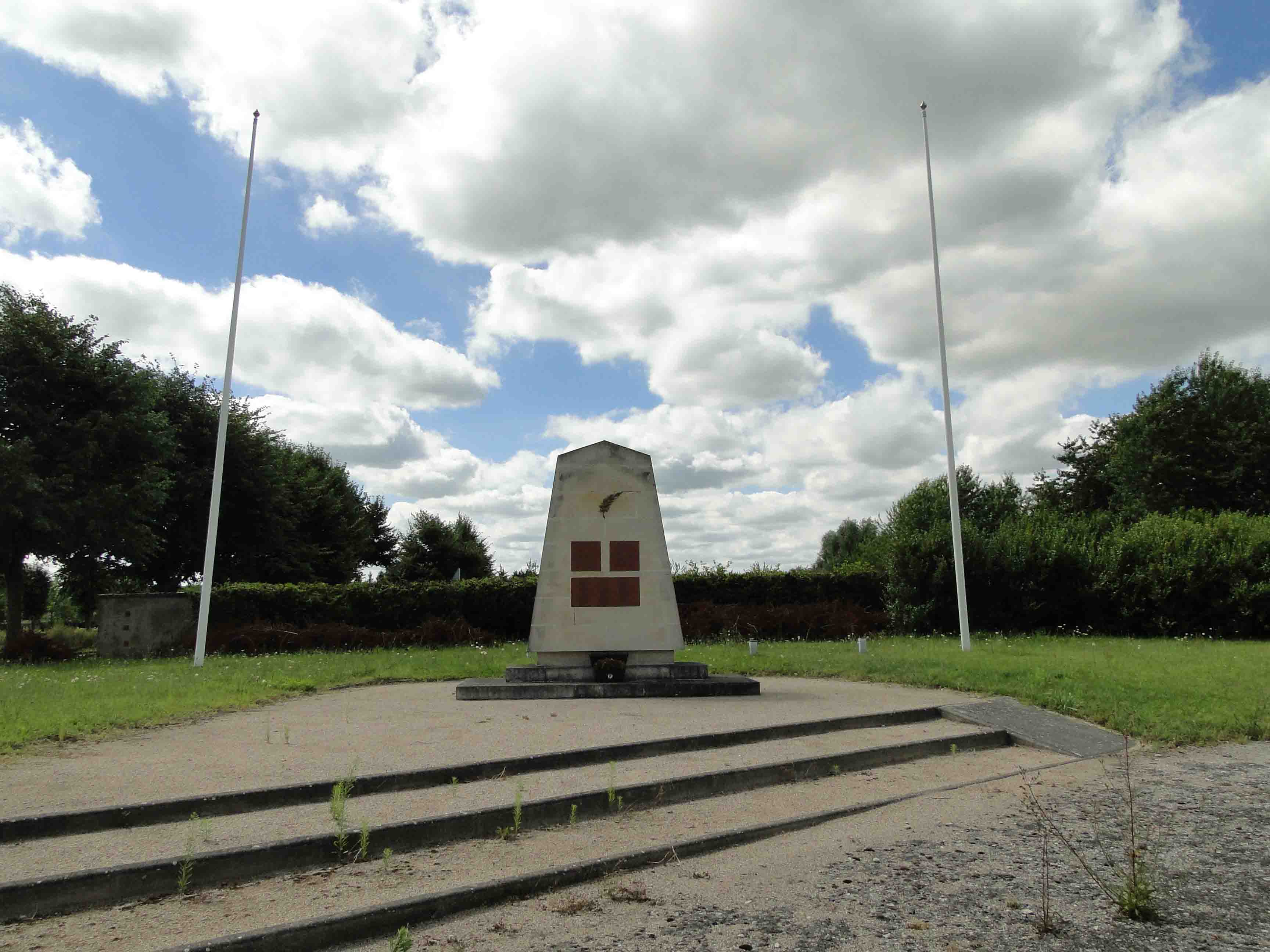 A concrete stele on which three plaques are affixed: one explanatory in English and its duplicate in French and the last with the list of American soldiers of the 386th Bomb Group who were killed during the war in the region. On the left side near the monument is a concrete pulpit with a plaque on the surface that contains information message for visitors.