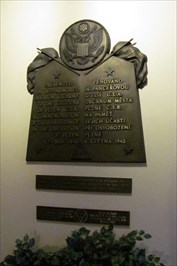The plaque remembers the liberation of the city of Pilsen (Plzeň) in May 1945 by the 16th Armored Division and Czech resistance fighters.