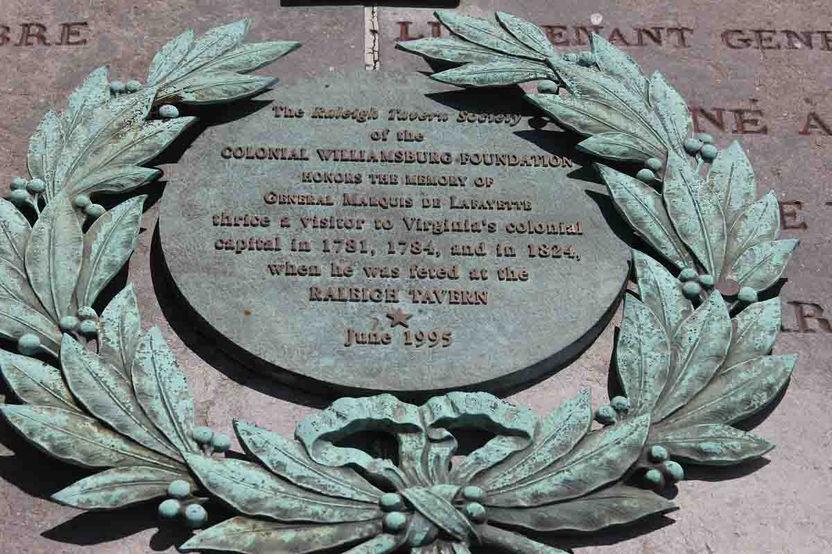 Two gravestones, Marquis' wife on the left and Marquis de Lafayette on the right, etched in French text. The gravestones are decorated with different plaques from different organizations or associations. In the middle of the gravestones, from top to bottom, is a cross with the badge of The Society of the Cincinnati on the bottom, followed by the green circle plaque with laurel wreath from the The Raleigh Tavern Society of the Colonial Williamsburgh Foundation, then a smaller green plaque with laurel wreath by First Company Governor's Foot Guard of Hartford , Connecticut are placed. Two bronze plaques on the top right corner of Marquis' gravestone are from the Mount Vernon Ladies' Association and The General Henry Knox Museum. Over the gravestones are more several plaques with a standing American flag in the middle that also holds another plaque. The Lafayette graves are enclosed with a low metal boundary gate. Marquis de Lafayette is buried here because his own sister and mother-in-law were victims of The Terror and are buried in the mass grave. He was buried in Picpus cemetery in soil brought back from Bunker Hill in 1825. Originally, Lafayette had planned his burial in soil brought back from each of the twenty-four states he had visited in 1824-1825. Unfortunately, toward the end of his American tour, the steamship Mechanic carrying Lafayette, his entourage, and the soil that Lafayette had collected, sunk in the Ohio River. The next best thing, Lafayette thought, was soil from Bunker Hill. His son, Georges Washington Lafayette, complied with his wish, spreading the American soil over his interred remains, filling his grave. The M. J. P. Y. R. G. D. inscribed on Marquis' gravestone is Marquis' full name, Marie-Joseph Paul Yves Roch Gilbert du Motier de La Fayette. The Society of Cincinnati, the Curator of Picpus Cemetery, and the Military Governor of Paris combined resources to restore the wreath and it was rededicated on 5 July 2022.