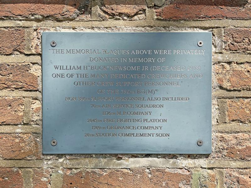 The memorial was erected by the Essex Anglo-American Goodwill Association (EAAGA). The memorial is constructed of brick with a stone angled cap and a stone plinth. A stone tablet with the EAAGA blue symbol on it followed by the commemoration message in English could be seen on the front side of the monument. Below it, another plaque was placed for the dedicators. Also, more plaques with the same inscriptions (except on the name lists) could be seen to the left and right sides of the monument. The plaques commemorate the 386th Bomber Group then list the name of the Honor Roll from the 552nd, 553rd, 554th, and 555th bomb squadrons. Inscribed in relief, the plaques also bear the 9th Air Force, 552nd and 553rd bomb squadron insignias (on the left side of the monument) while the 9th Air Force, 554th and 555th bomb squadron insignias are on the right side. Then, at the foot of the plinth is an inscription of the EAAGA’s name.