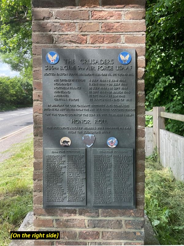 On 2 October 1944, the 386th Bomb Group moved to Beaumont-sur-Oise (A-60) Airfield, in Normandy, France, where there is a monument honoring their service there. They are also featured in several displays at the Utah Beach Museum. The 386th BG is also honored by a memorial window at the church of Little Easton.