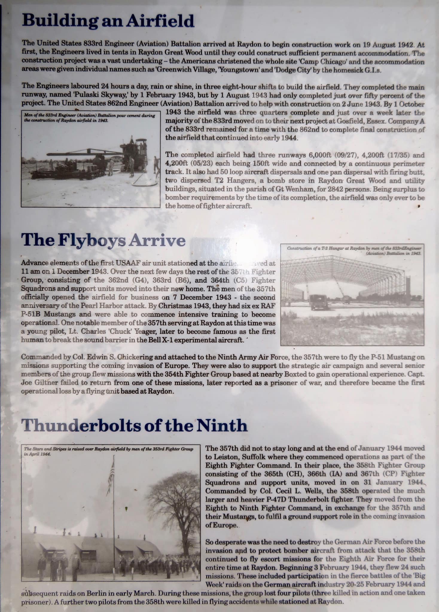 The United States 833rd Engineer (Aviation) Battalion arrived at Raydon to begin construction work on 19 August 1942. At first, the Engineers lived in tenth in Raydon Great Wood until they could construct sufficient permanent accommodation. The construction project was a vast undertaking - the Americans christened the whole site 'Camp Chicago' and the accommodation areas were given individual names such as 'Greenwich Village, 'Youngstown' and 'Dodge City' by the homesick G.I.s.