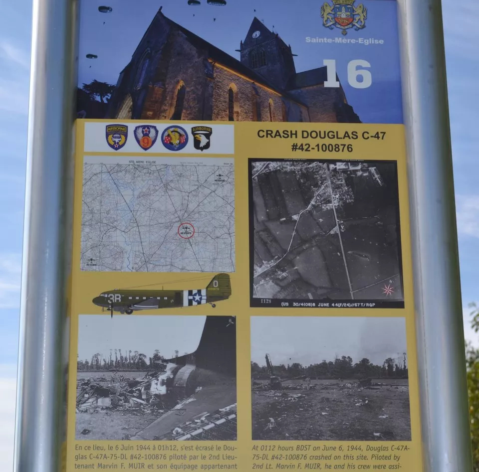 Two minutes before reaching the DZ, the aircraft was hit in the crew compartment and fuel tanks, causing it to instantly catch fire. Fighting at the controls of their aircraft, 2nd Lieutenant Marvin F. MUIR and his crew allowed 17 paratroopers to evacuate the aircraft at the cost of their lives before it crashed here. One of the paratroopers, wounded, remained on the plane and perished with the crew. IN MEMORY OF THE OCCUPANTS OF THE DOUGLAS C-47A #42-100876
