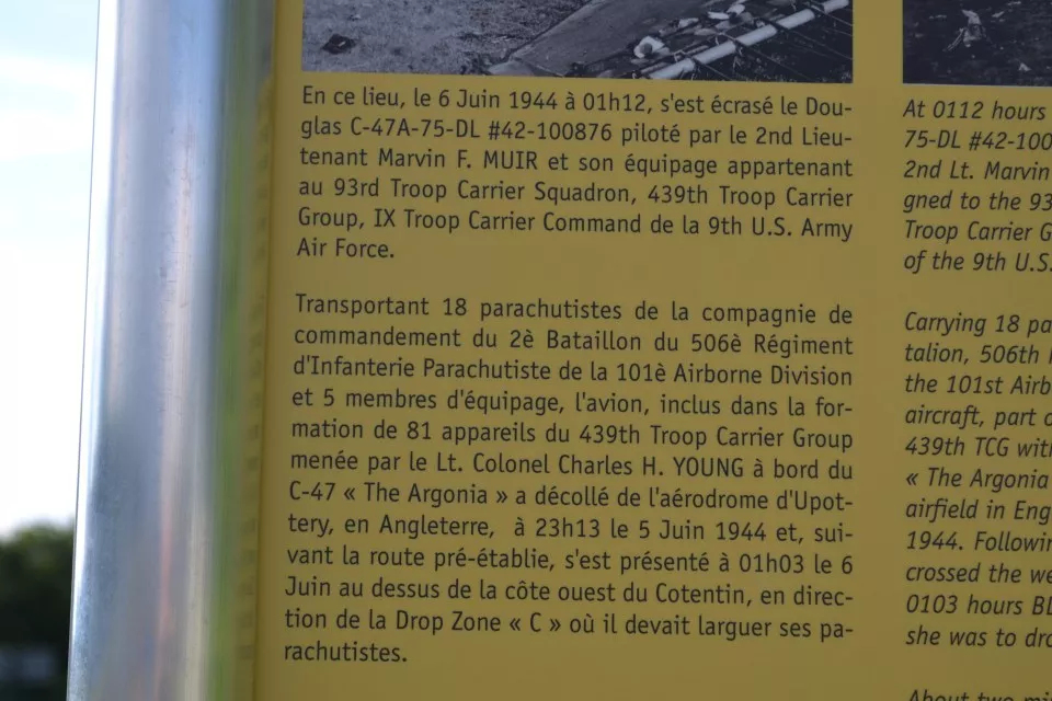 Deux minutes avant d'atteindre la DZ, l'appareil fut touché au niveau du compartiment équipage et des réservoirs de carburant, ce qui lui fit prendre feu instantanément. Se battant aux commandes de leur appareil, le 2nd Lieutenant Marvin F. MUIR et son équipage permirent, au coût de leurs vies, à 17 parachutistes d'évacuer l'appareil avant que celui-ci ne s'écrase à l'endroit où vous vous trouvez. L'un des parachutistes, blessé, est resté dans l'avion et a péri avec l'équipage. A LA MÉMOIRE DES OCCUPANTS DU DOUGLAS C-47A #42-100876