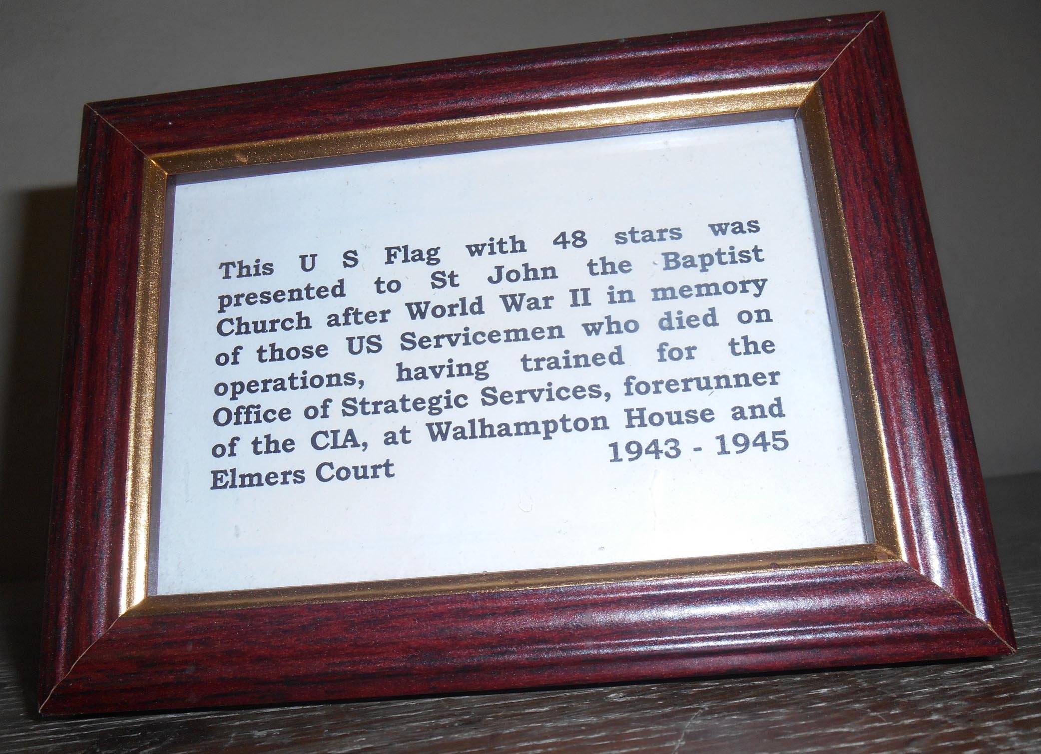 This U S Flag with 48 stars was presented to St John the Baptist Church after World War II in memory of those US Servicemen who died on operations, having trained for the Office of Strategic Services, forerunner of the CIA, at Walhampton House and Elmers Court 1943-1945 |