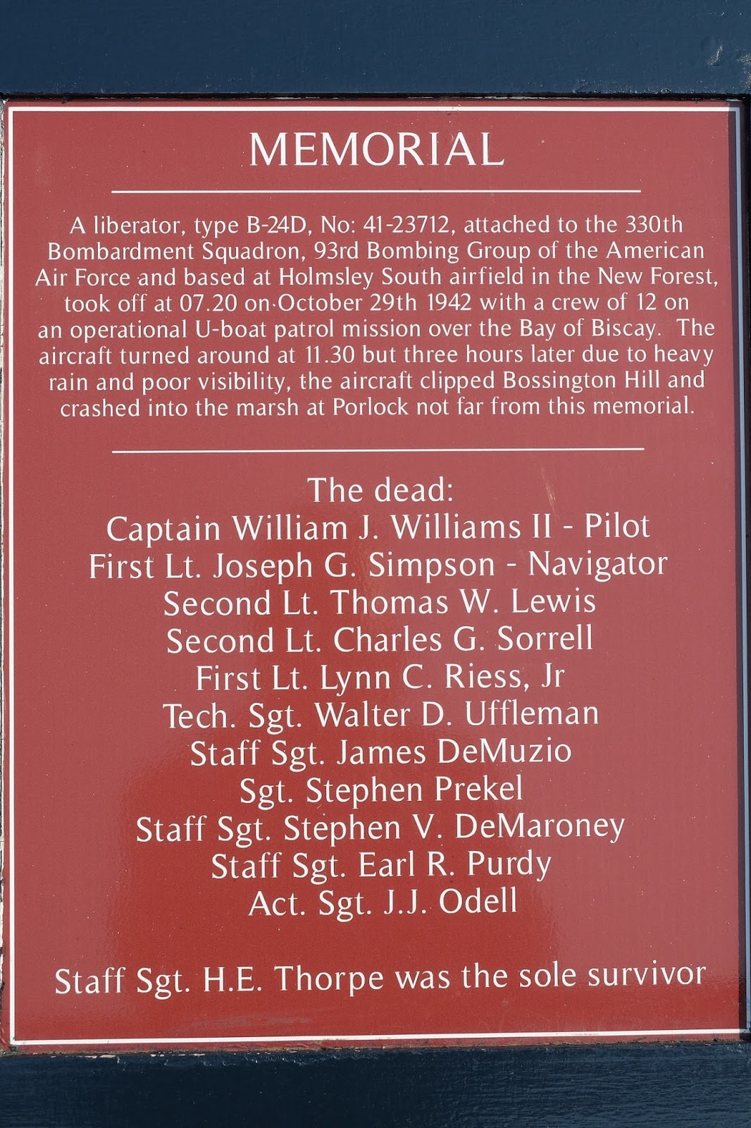 On 29th October 1942, B-24D #41-23712 “Ambros” crashed on Porlock Marsh having clipped the top of Bossington Hill in poor weather conditions: rain and low cloud. There were 12 crewmen on board but was only one survivor: Staff Sergeant H B Thorpe. The Liberator, which was working for RAF Coastal Command, had taken off at 7.20 am from Holmsley in Hampshire on a routine U-boat patrol mission over the Bay of Biscay. On its return journey, at about 3.30 pm, it crashed in West Somerset.
