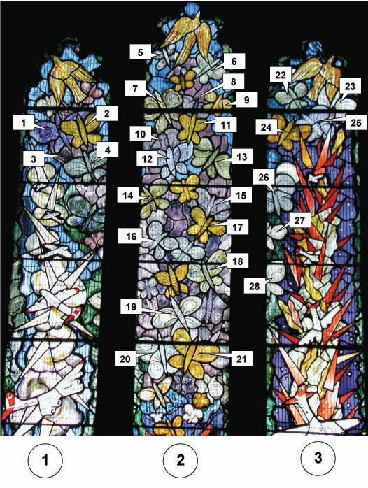The Anstey Window Memorial consists of three stained glass panels labeled 1 (left), 2 (center), and 3 (right). Each panel features numbered butterflies (1–28), with names of fallen airmen etched into their wings. Each butterfly wing is divided into four sections: