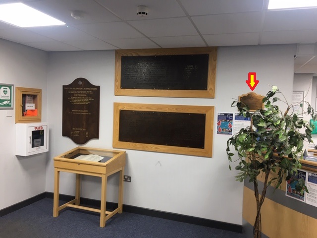 A nowy-headed brass plaque on a wooden backboard (which was originally a simple rectangle, but now mirrors the shape of the brass plaque). The plaque has a double-string border and is inscribed in English in black lettering. Above the inscription are a pair of engraved wings with a star at the center, and above it are three images of Dakotas then beneath which is a parachute. The plaque serves as a token of appreciation to the people of Lincolnshire for the hospitality they have shown during the group’s stay in the county.