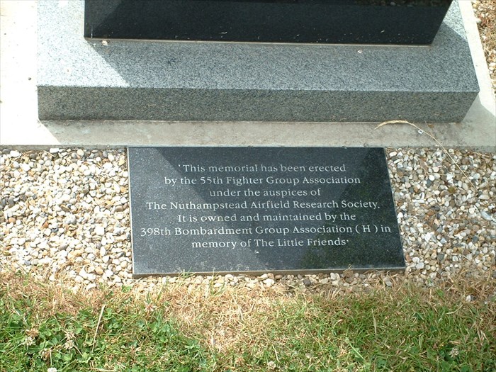 An upright, black marble stone, set on a small 2 stepped base, with a sloping top. The monument is inscribed with a dedication message followed by a list of names in 2 columns who died while stationed at RAF Nuthampstead. Depicted images on the top of the monument are the 55th Fighter Group insignia and crests of the 38th, 338th, and 343rd Fighter Squadron. The memorial was unveiled on June 7, 2006. There is another plaque at the foot on the rear which contains the erection information for the monument.