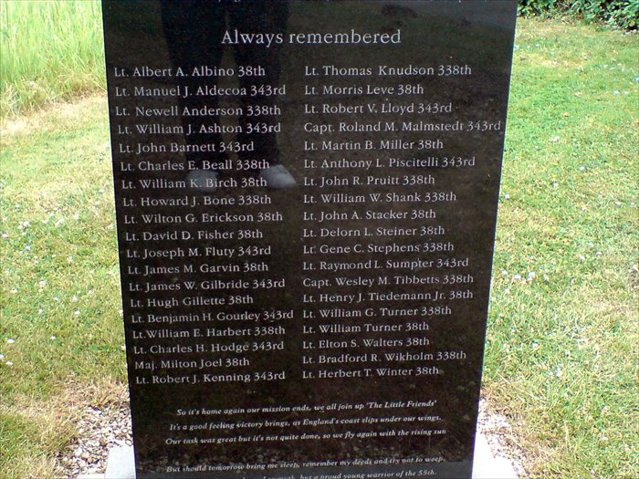 Lt. Thomas Knudson 338th Lt. Morris Leve 38th Lt. Robert V. Lloyd 343rd Capt. Roland M. Malmstedt 343rd Lt. Martin B. Miller 38th Lt. Anthony L. Piscitelli 343rd Lt. John R. Pruitt 338th Lt. William W. Shank 338th Lt. John A. Stacker 38th Lt. Delorn L. Steiner 38th Lt. Gene C. Stephens 338th Lt. Raymond L. Sumpter 343rd Capt. Wesley M. Tibbetts 338th Lt. Henry J. Tiedemann Jr. 38th Lt. William G. Turner 338th Lt. William Turner 38th Lt. Elton S. Walters 38th Lt. Bradford R. Wikholm 338th Lt. Herbert T. Winter 38th |