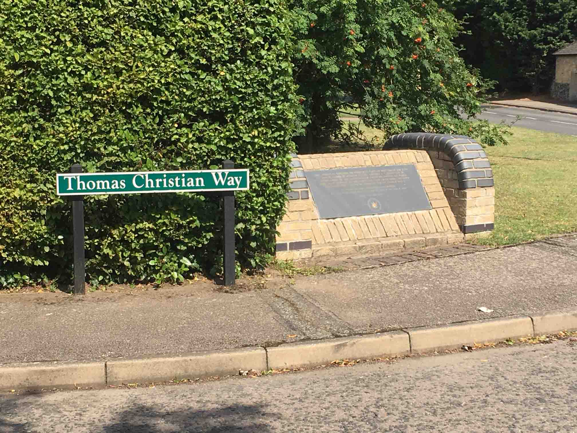 A metal plaque set into a sloping brick wall (which was once part of a lych gate) showing a dedication message. The inscription is written in English in yellow lettering. Below the inscription is the insignia of the 361st Fighter Group. The memorial commemorates Col Thomas J. J. Christian, Jr. and also pertains to the Thomas Christian Way which is named after him in his honor. Col. Thomas Christian was the commander of the 361st FG based at Bottisham. He was killed on August 12th, 1944, at the age of 28. The memorial, which originally had a roof, was unveiled by his daughter in 1955.