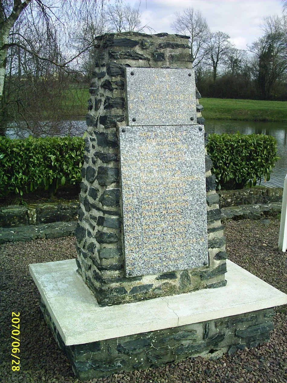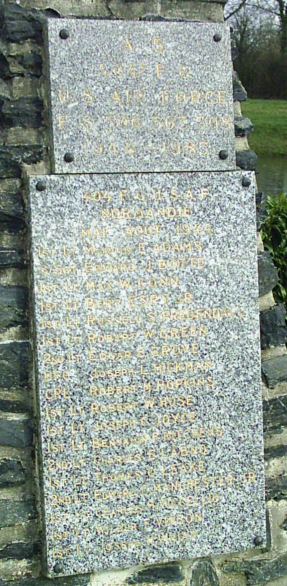 A vertical stone pillar with a long rectangular plaque. The monument remembers Airfield A-5, known as Advanced Landing Ground "A-5", or Chippelle Airfield. The monument also members the of the 404th Fighter Group who fell while serving form this airfield in 1944. The 404th Fighter group consisted of the 506th (4K), 507th (Y8), 508th (7J) Fighter Squadrons (P-47D).