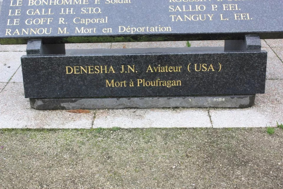 A narrow, rectangular, black plaque commemorating 2Lt Denesha. The plaque is inscribed in French in gold lettering. On June 7, 1944, a plane crashed at about 2:15 p.m. at Château Billy, in the Plaine-Ville area. It was piloted by American Lieutenant John Nathan Denesha.