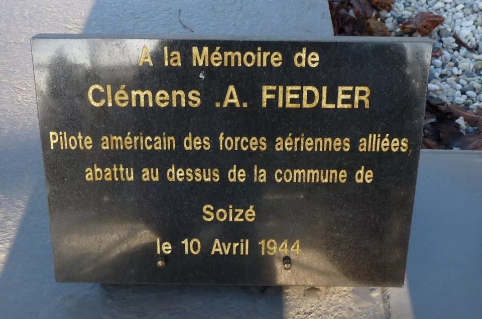A rectangular, black plaque inscribed with a commemoration message that is written in French in gold lettering. On April 10, 1944, 1Lt Fiedler was struck by flak while strafing Romarantin Airdrome in France. His mustang was streaming black oil and glycol. Having to evacuate his P-51, he jumped to a reasonable altitude. However, his parachute did not open. The body of 1Lt Fiedler was not recovered until two days later, two kilometers from the point where his plane fell. His body had been stripped of almost all his personal belongings by an unidentified individual. 1Lt Fiedler was buried in the village cemetery and the local residents made donations to erect a stele in his honor.