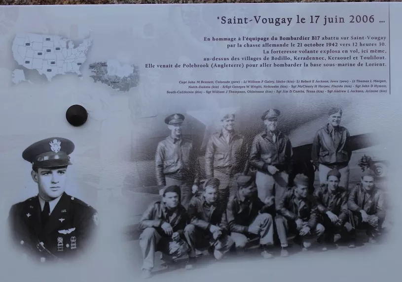 In homage to the crew of the B-17 bomber that was shot down over St. Vougay by German fighters on October 21, 1942, around 12:30 pm.