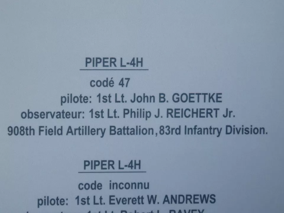 A Piper of the 908th Artillery Battalion was sent to spot enemy artillery fire. It was mortally wounded by German anti-aircraft fire and crashed at 11.30 a.m. at Trébéfour, killing the 1st Lt Goettke and Reichert.