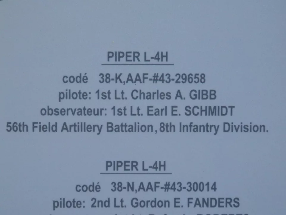 PIPER L-4H code 38-K,AAF-#43-29658 pilot: 1st Lt. Charles A. GIBB observer: 1st Lt. Earl E. SCHMIDT 56th Field Artillery Battalion, 8th Infantry Division.