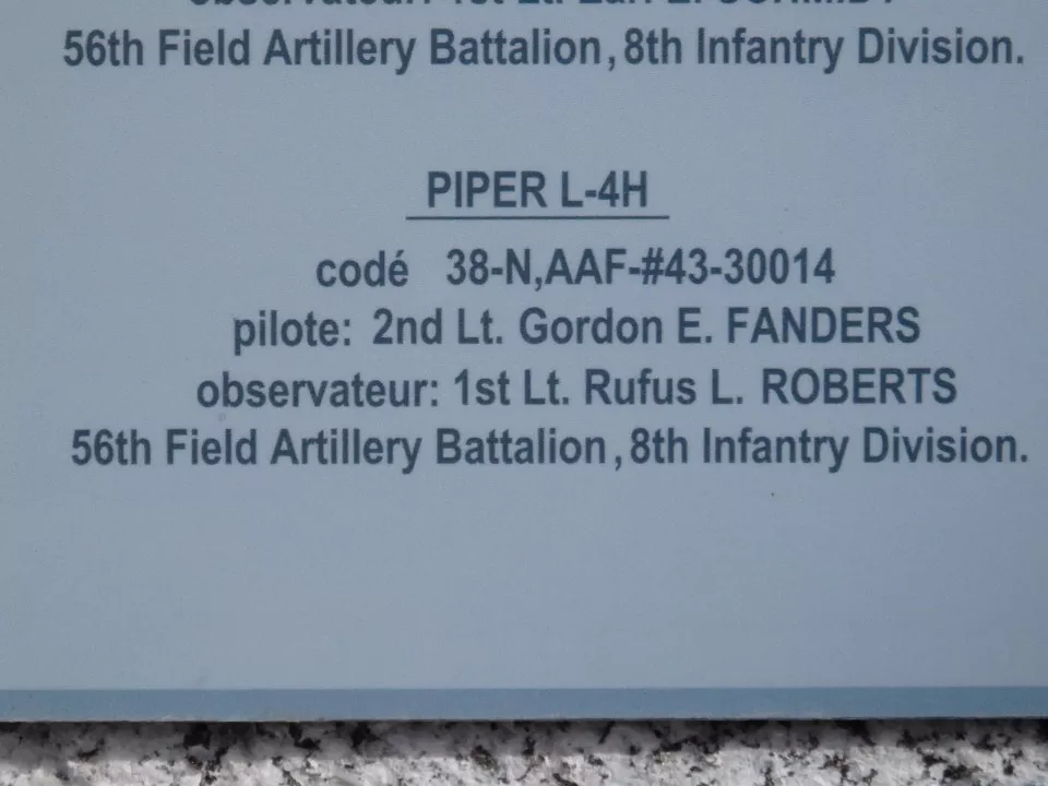 PIPER L-4H codé 38-N,AAF-#43-30014 pilote: 2nd Lt. Gordon E. FANDERS observateur: 1st Lt. Rufus L. ROBERTS 56th Field Artillery Battalion, 8th Infantry Division. |