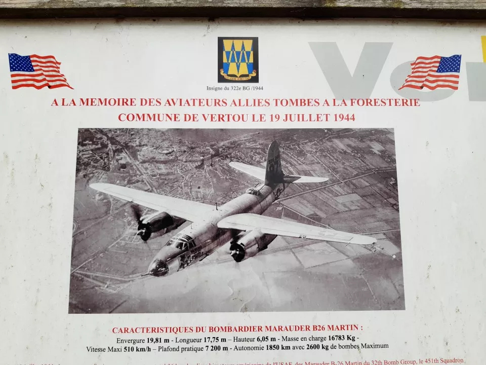 Le 19 juillet 1944, deux groupes d'avions comprenant au total 36 bombardiers bimoteurs américains de l'USAF, des Marauder B-26 Martin du 32th Bomb Group, le 451th Squadron bombardier de la 9th Air Force, décollent d'Angleterre de la base n°485 d'Andrew Field dans le comté d'Essex pour un raid de bombardement sur Nantes. Vers 19h50, le premier groupe de bombardiers effectue son largage ayant pour objectifs principaux le pont ferroviaire de Pornic et le pont routier de Pirmil. Il essuie sans dommage des tirs de la Flack (défense antiaérienne ennemie). Au cours de cette opération, le pont de Pornic et le pont de Pirmil n'ont pais été atteints. Malheureusement, le quartier de Pirmil et les habitations rue Saint-Jacques ainsi que celles du Boulevard Victor Hugo sont en grande partie détruits et on déplore de nombreuses victimes. L'effet dc surprise passé, le deuxième groupe rencontre une défense active et des tirs plus précis de la Flack. Le bombardier B26 Marauder 41-31974-ER-R est touché au moteur gauche et de la fumée s'échappe de l'appareil. En difficulté, l'appareil quitte la formation et se retrouve rapidement sur le dos. Il entame alors une longue et tragique descente. Quelques membres de l'équipagé réussissent à évacuer l'appareil, suspendus à leurs parachutes. Ils sont alors la cible des tirs de fusil de l'ennemi. L'appareil, quant à lui, finit sa chute en s'écrasant sur la commune de Rezé, rue Jaunais, dans une culture maraîchère, en épargnant la population. Un seul aviateur survit, le mécanicien navigant JAMES.E.Jr. Caché par la population, mais trop grièvement blessé, son état nécessite une hospitalisation. Il est alors fait prisonnier. Dans ce même groupe de bombardiers, l'appareil Marauder B-26 41-35021 SS-L " le SHERIFF Rapides Parish Louisiana " est également sérieusement touché au niveau de l'aile droite. Une ' seconde salve provoque un incendie à bord. Le moteur droit sc décroche et l'aile est en partie brisée : l'avion entame une vrille fatale. Seuls quatre membres de l'équipage évacuent l'appareil et trois d'entre eux réussissent à ouvrir leur parachute. Grièvement blessé, l'un des trois parachutistes est immédiatement fait prisonnier. Il décédera de ses blessures le lendemain. L'avion en perdition s'écrase avec le reste de son équipage dans ce lieu, tout près du hameau de la" Foresterie" (champ appartenant à l'époque à M. Auguste Priou). Le crash est enregistré peu avant 20h. Les deux seuls survivants, le mécanicien navigant (sergent chef Jack H.CHIDESTER) ainsi que le mitrailleur de queue (sergent chef Wilburn W.HAMPTON) réussissent à échapper à l'ennemi, aidés en premier lieu par la population vertavienne, puis par différents réseaux de la Résistance française. Ils réussissent â regagner l'Angleterre via l'Espagne.