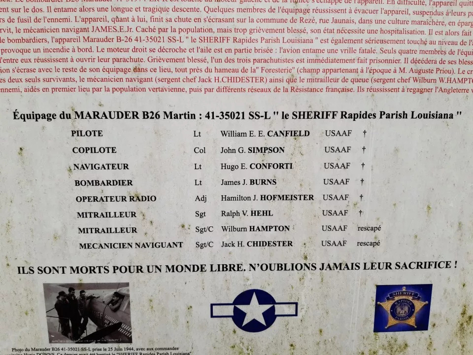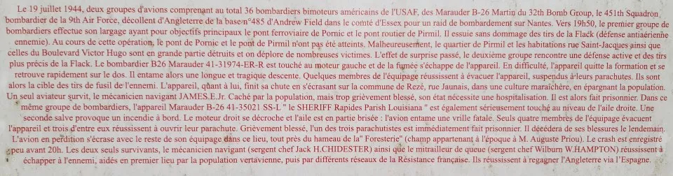 On July 19, 1944, two groups of aircraft including a total of 36 twin-engine American bombers of the USAF, Marauder B-26 Martin of the 32nd Bomb Group, the 451st Bomber Squadron of the 9th Air Force, took off from England from the base n°485 of Andrew Field in the county of Essex for a bombing raid on Nantes. Around 7:50 pm, the first group of bombers made its drop, having for main objectives the railway bridge of Pornic and the road bridge of Pirmil. It was hit by a flak (enemy anti-aircraft defense) fire without any damage. During this operation, the Pornic bridge and the Pirmil bridge were not hit. Unfortunately, the district of Pirmil and the houses on rue Saint-Jacques as well as those on Boulevard Victor Hugo were largely destroyed and we deplore the many victims. The surprise effect passed, and the second group met an active defense and more precise shooting of the Flack. The B26 Marauder 41-31974-ER-R was hit in the left engine and smoke emitted from the aircraft. In difficulty, the aircraft left the formation and was soon on its back. It then began a long and tragic descent. Some of the crew members managed to evacuate the aircraft, hanging from their parachutes. They were then the target of enemy rifle fire. The plane ended its fall by crashing in the town of Rezé, rue Jaunais, in a market garden, sparing the population. Only one airman survived, the flight engineer JAMES.E.Jr. Hidden by the population, but seriously wounded, his condition required hospitalization. He was then taken prisoner. In the same group of bombers, the Marauder B-26 41-35021 SS-L " the SHERIFF Rapides Parish Louisiana " was also seriously hit in the right wing. A second salvo caused a fire on board. The right engine stalled and the wing was partially broken: the aircraft entered a fatal spin. Only four crew members evacuated the aircraft and three of them managed to open their parachutes. One of the three parachutists was seriously injured and immediately taken prisoner. He died of his injuries the next day. The plane crashed with the rest of its crew in this area, near the hamlet of "Foresterie" (a field belonging to Mr. Auguste Priou at the time). The crash was recorded shortly before 8 pm. The only two survivors, the flight engineer (Master Sergeant Jack H. CHIDESTER) and the tail gunner (Master Sergeant Wilburn W. HAMPTON) managed to escape from the enemy, helped first by the people of Verdun, then by various French Resistance networks. They managed to reach England via Spain.
