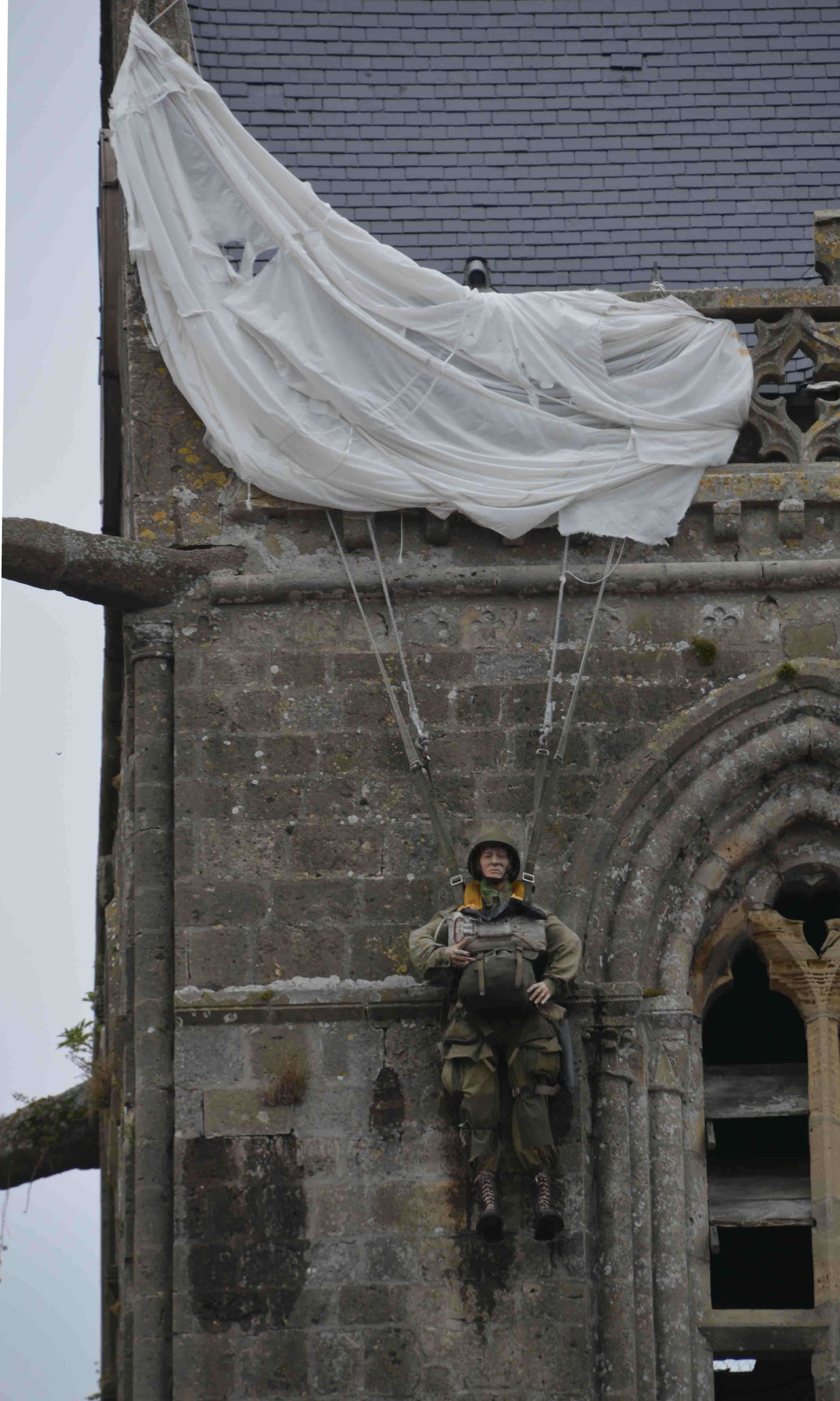 A uniformed mannequin hanging from a parachute and rigging on the steeple, in honor of Pvt John Steele (of F Company, 3rd Battalion, 505th Parachute Infantry Regiment), his fateful jump, and the liberation of the town.