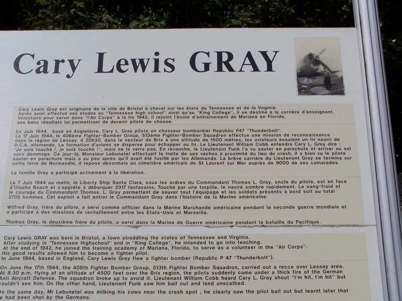 En Juin 1944, base en Angleterre, Cary L. Gray pilote un chasseur bombardier Republic P47 "Thunderbolt". Le 17 Juin 1944, le 406ème Fighter-Bomber Group, 513ème Fighter-Bomber Squadron effectue une mission de reconnaissance dans le region de Lessay. A 20h30, dans le secteur de Brix a une altitude de 1500 metres, les aviateurs essuient un tir nourri de D.C.A. allemande. La formation d'avions se disperse pour échapper au tir. Le Lieutenant William Cobb entendra Cary L. Gray dire : "Je suis touché !, je suis touche !", mais ne le verra pas. En revanche, le Lieutenant Funk l'a vu sauter on parachute et arriver au sol sans dommage. Ce jour-là, Monsieur Lebunetel effectuait la traite de ses vaches à proximité du lieu du crash, il a bien vu le pilote sauter en parachute mais a su peu après qu'il avait ete fusillé par les Allemands. La brève carrière du Lieutenant Gray se termina sur cette terre de Normandie, il repose désormais au cimetière américain de St Laurent sur Mer auprès de 9000 do ses camarades.