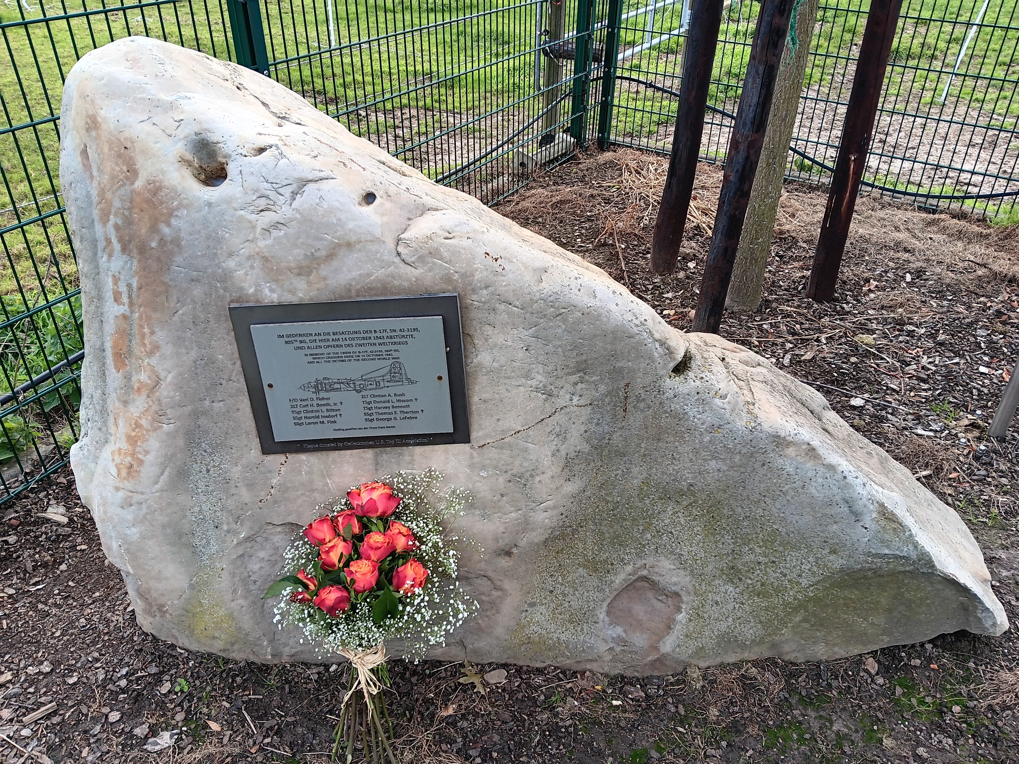 The monument remembers B-17 (42-3195)of the 366th Bomber Squadron, 305th Bomber Group, that crashed nearby after being shot down on October 14, 1943 during the "Black Thursday" bombing raid. This crew included three KIA, one KIA/MIA and six POW's (all of which survived the war and returned). The one Missing in Action, 2Lt Carl Booth, Navigator, his name is on the Wall of the Missing at Margraten Cemetery in the Netherlands.