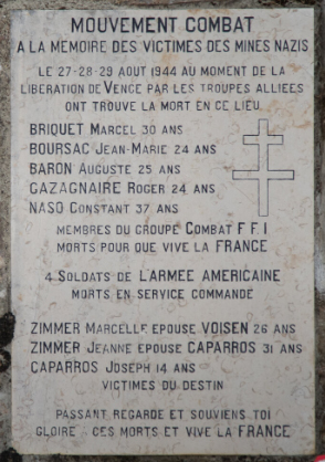 Two commemorative plaques that are written in French commemorating the U.S. soldiers. The right plaque focuses on the 40th Engineer Combat Regiment and lists 3 names while the left plaque remembers the liberation of Vence and lists the names of the victims of the Nazis and mentions 4 American soldiers killed during the liberation.
