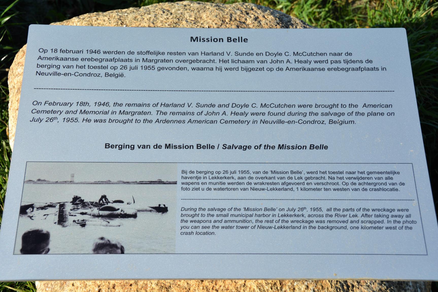Bij de berging op 26 juli 1955, van de 'Mission Belle', werd het toestel naar het gemeentelijke haventje in Lekkerkerk, aan de overkant van de Lek gebracht. Na het verwijderen van alle wapens en munitie werden de wrakresten afgevoerd en verschroot. Op de achtergrond van de foto ziet u de watertoren van Nieuw-Lekkerland, 1 kilometer ten westen van de crashlocatie.