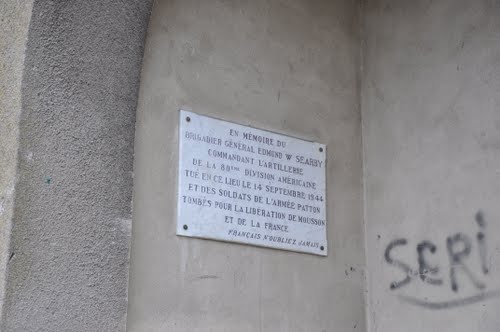 The plaque remembers Brigadier General Edmund Searby who the Division Artillery Commander o the 80th Infantry "Blue Ridge" Division who was killed during the Battle of Mousson Hill.
