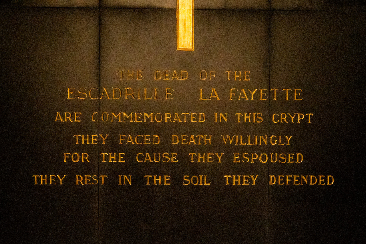 In the memorial crypt are 68 sarcophagi, one for each of the aviators of the Lafayette Flying Corps who lost their lives during World War I. Forty-nine of these aviators are entombed in the crypt along with two of their French commanding officers. The remainder rest in other locations, or their remains were never recovered