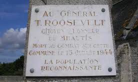 The plaque remembers Brigadier General Theodore Roosevelt, Assistant Division Commander of the 4th Infantry 'Ivy' Division, who died in this town in July 1944.