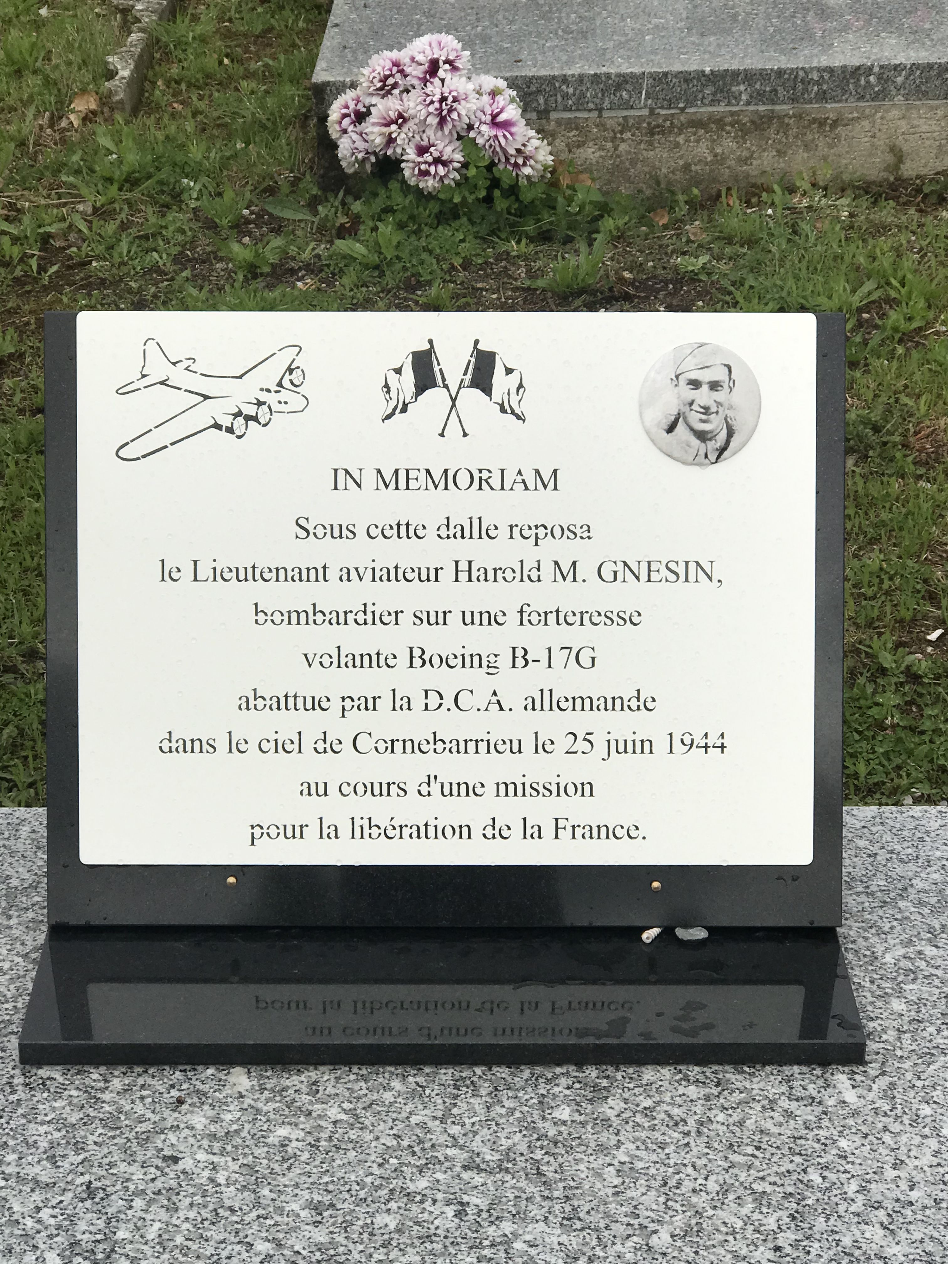 A marble tomb with a standing rectangular white slab commemorating Lt Aviator Harold Gnesin, who was killed in a plane crash during World War II. The inscription is written in French in black lettering. It has a Boeing B-17 Flying Fortress insignia on the top left corner, a crossed flag insignia in the top center, and a picture of Lt Gnessin on the top right corner of the slab.