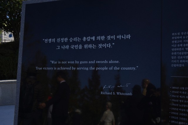 A painted statue of Brigadier General Richard S. Whitcomb along with statues of South Korean citizens mounted on an inscribed base in front of a marble curved wall with inscriptions that explain the Korean War.