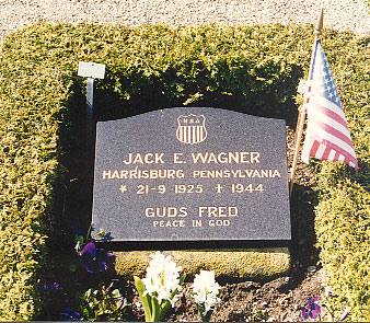 The Isolated Burial (ISOB) of Staff Sergeant Jack Wagner of the 565th Bomber Squadron, 389th Bomber Group. SSG was the tailgunner of B-17 (42-95144) 'European Clipper'. On June 20, 1944, on its way to the target 'European Clipper' collided with B-24 (42-100351) that was flying above it. B-24 (42-100351) lost a propeller and crashed. 'European Clipper' lost its tail section and went into a spinning dive which ended with the aircraft crashing in the sea approximately 2 kilometers southeast of Kelsnor lighthouse on the island of Langeland. SSG Wagner was killed in the crash. On July 8, 1944 a Danish civilian found his body washed ashore on the east end island of Ærø. On July 11, 1944 he was laid to rest in Marstal cemetery with military honors.