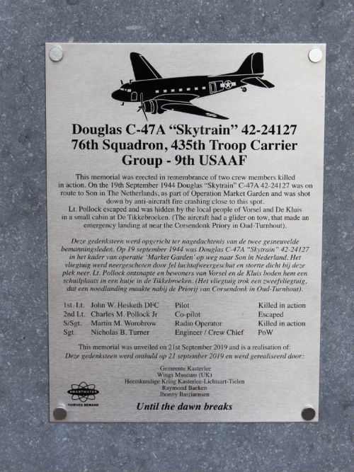 The memorial remembers the crew of the C-47 (42-24127) of the 76th Squadron, 425th Troop Carrier Group that was shot down here during "Operation Market" Garden on September 19, 1944.