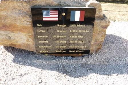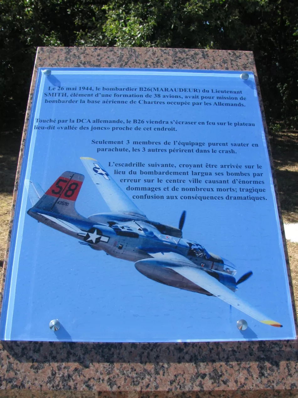 The memorial remembers B-26 (42-96199) of the 557th Bomber Squadron, shot down by German AA fire on a bombing mission to the Chartres airfield on May 26th 1944.