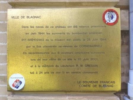 The survivors of the US B-17 42-102463 from mission 441 were held prisoner in the cellars of this castle in June 1944 after having been shot down by German flak over Cornebarrieu on June 25th 1944. With thanks to the eight American survivors who visited the site on June 25th 2001 and in memory of drafted Lt HM Gnessin, killed at 24.