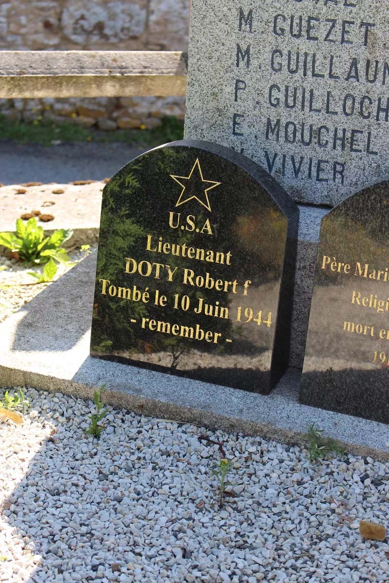 A black headstone with gold lettering commemorating Lt Doty at the base of a stone pillar honoring the town's war dead.