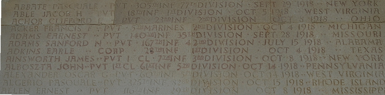 Jacob H. Able entered the military service in West Virginia. He served in the U.S. Army during World War I as a Private in Company F, 18th Infantry Regiment, 1st Infantry Division. He was Killed in Action but declared "Missing" on October 5, 1918 and is memorialized on Tablets of the Missing, Meuse-Argonne American Cemetery and Memorial, Romagne-sous-Montfaucon, Departement de la Meuse, Lorraine, France.